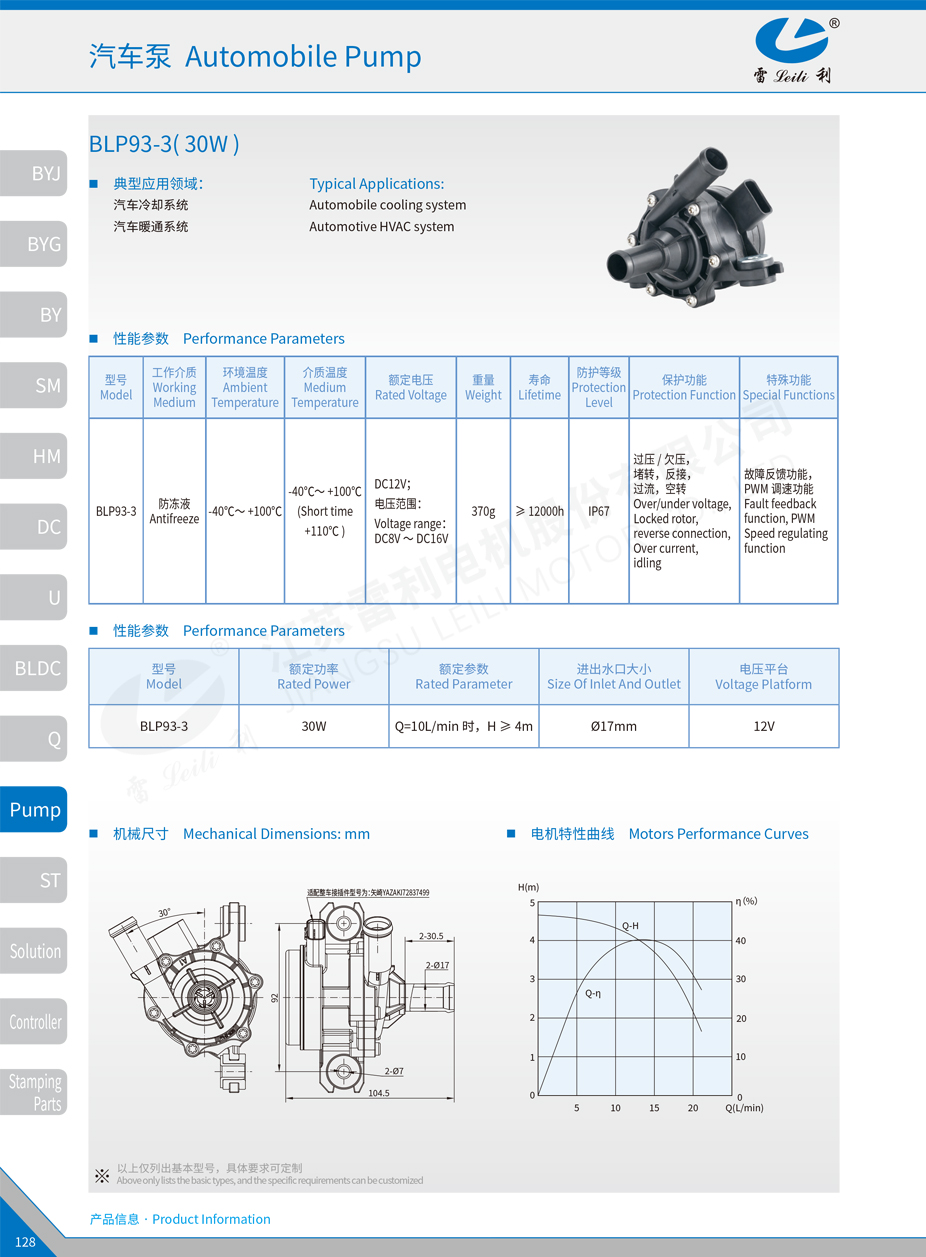 | BLP93-3 | 30W | Q=10L/min 时,H ≥ 4m | Ø17mm | 12V |