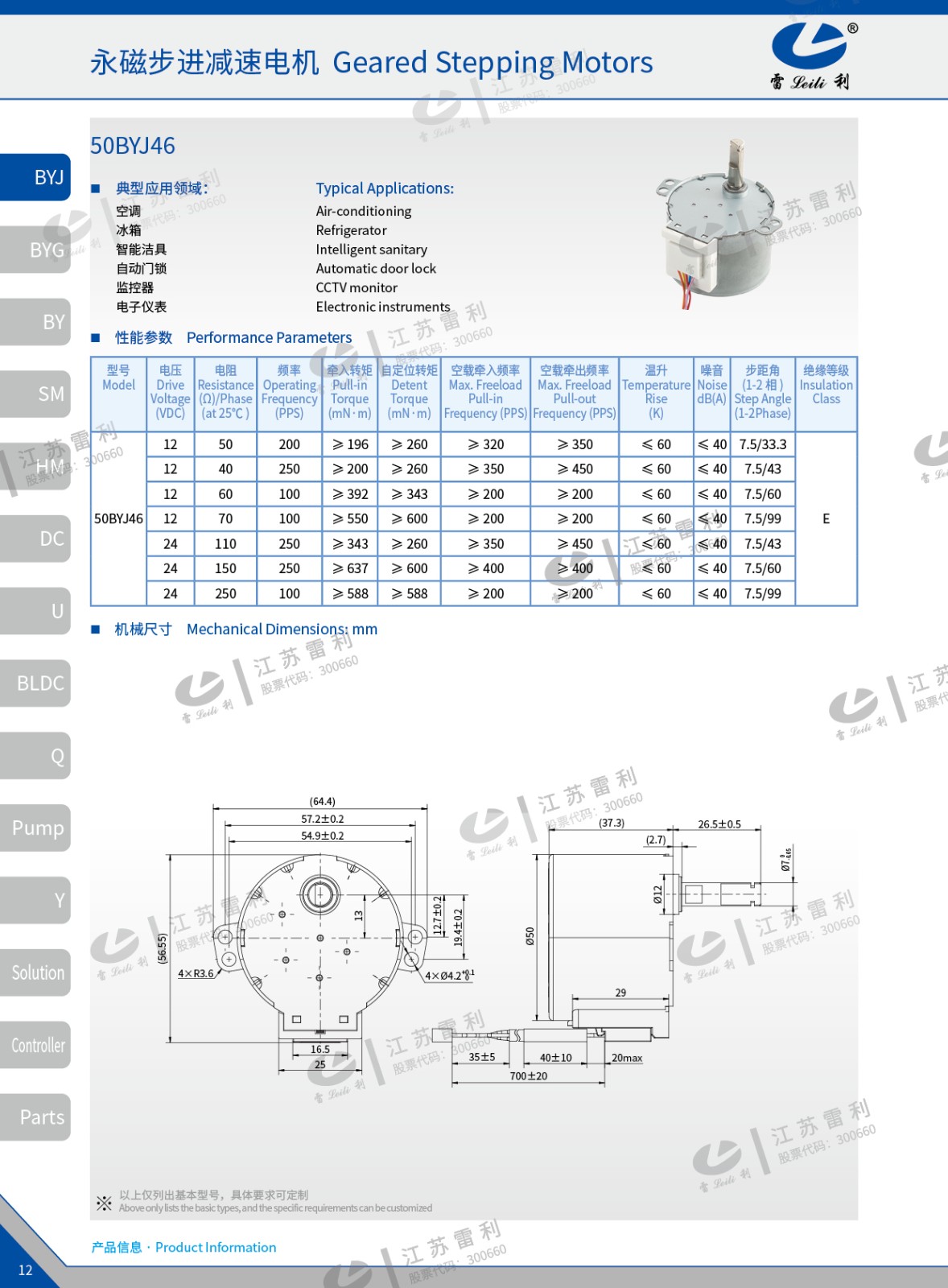 | 50BYJ46 | 12 | 50 | 200 | ≥196 | ≥260 | ≥320 | ≥350 | ≤60 | ≤40 | 7.5°/33.3 | E |