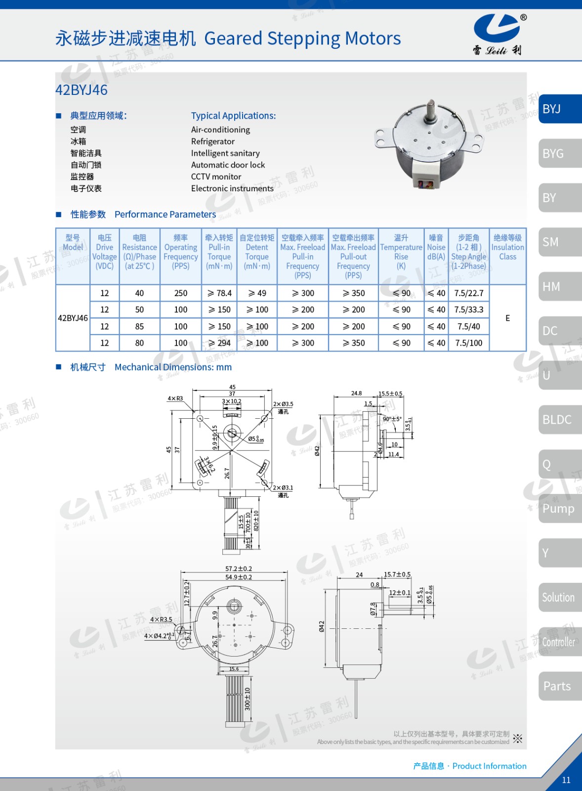 | 42BYJ46 | 12 | 40 | 250 | ≥78.4 | ≥49 | ≥300 | ≥350 | ≤90 | ≤40 | 7.5°/22.7 | E |
