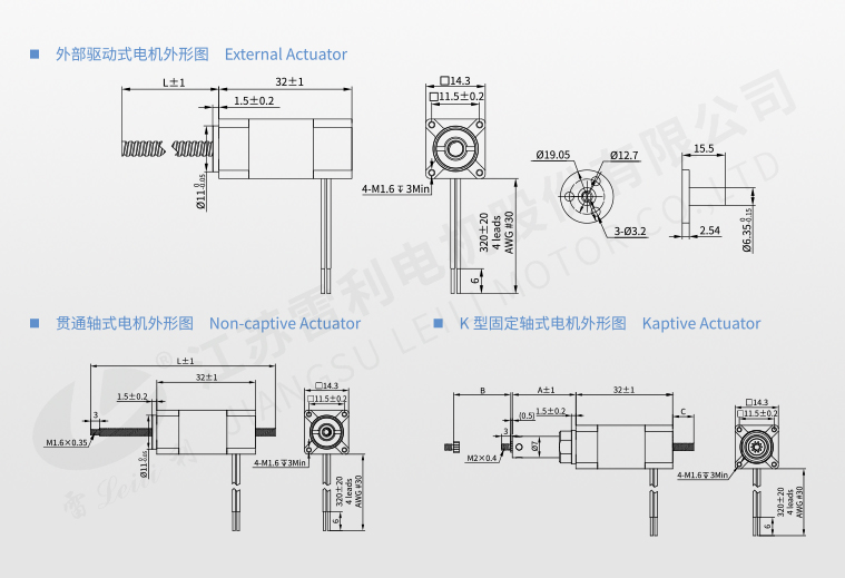 滑动丝杆线性执行器有8种尺寸,外形尺寸从14mm到86mm。 四种结构可以选择:外部驱动式,贯通轴式,C型固定轴气缸式和K型固定轴式。