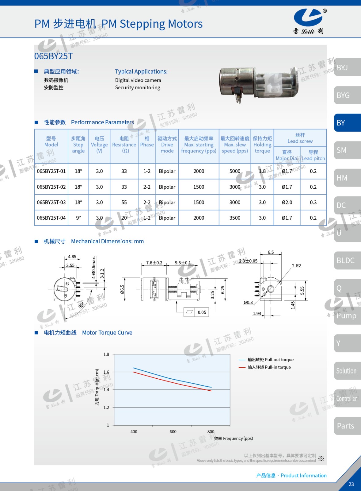 | 065BY25T-04 | 9° | 3.0 | 20 | 1-2 | Bipolar | 2000 | 3500 | 3.0 | Ø1.7 | 0.2 |