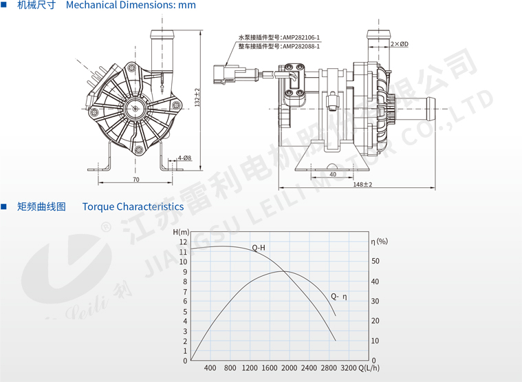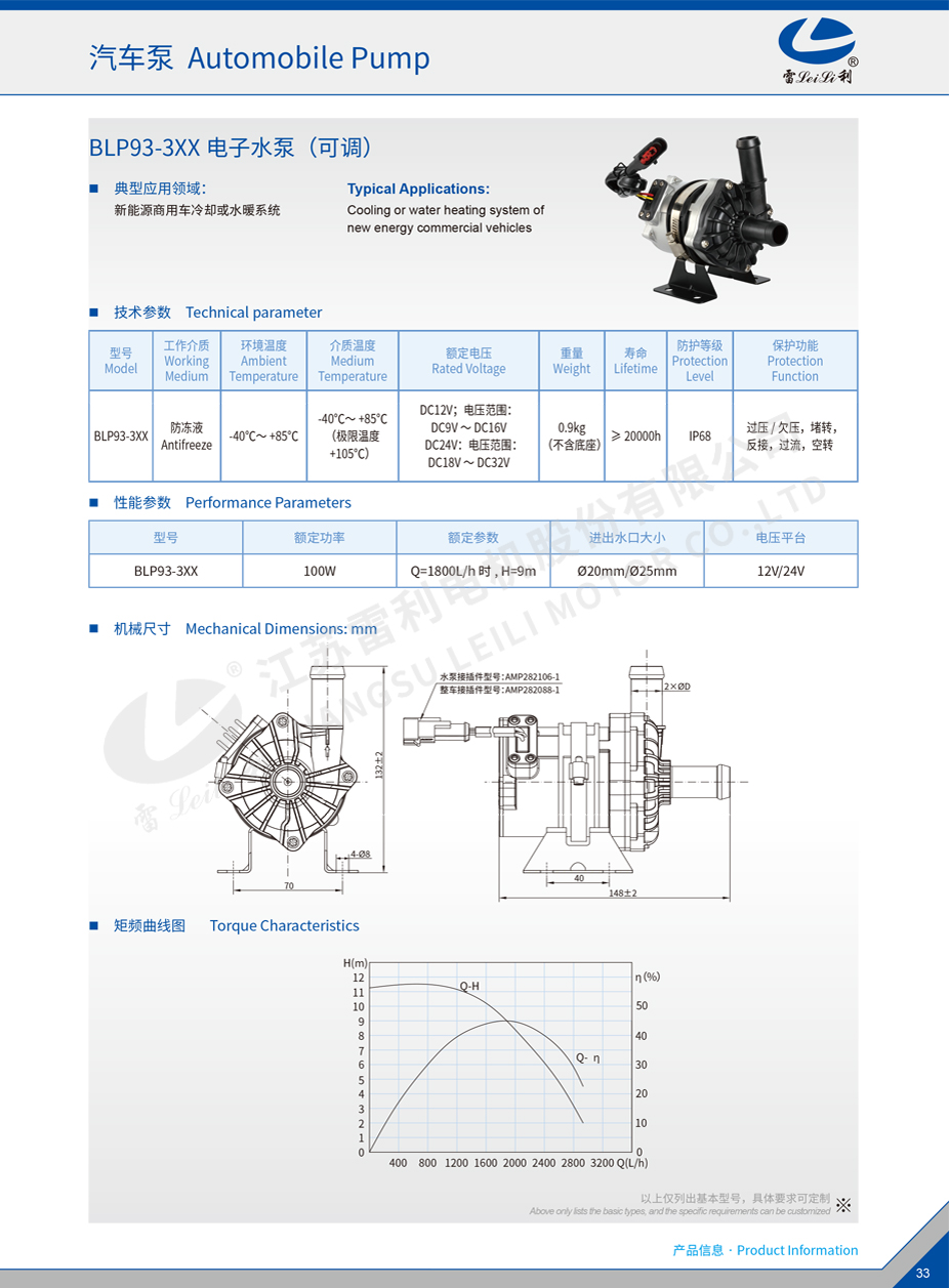 | BLP93-3XX | 100W | Q=1800L/h 时 , H=9m | Ø20mm/Ø25mm | 12V/24V |
