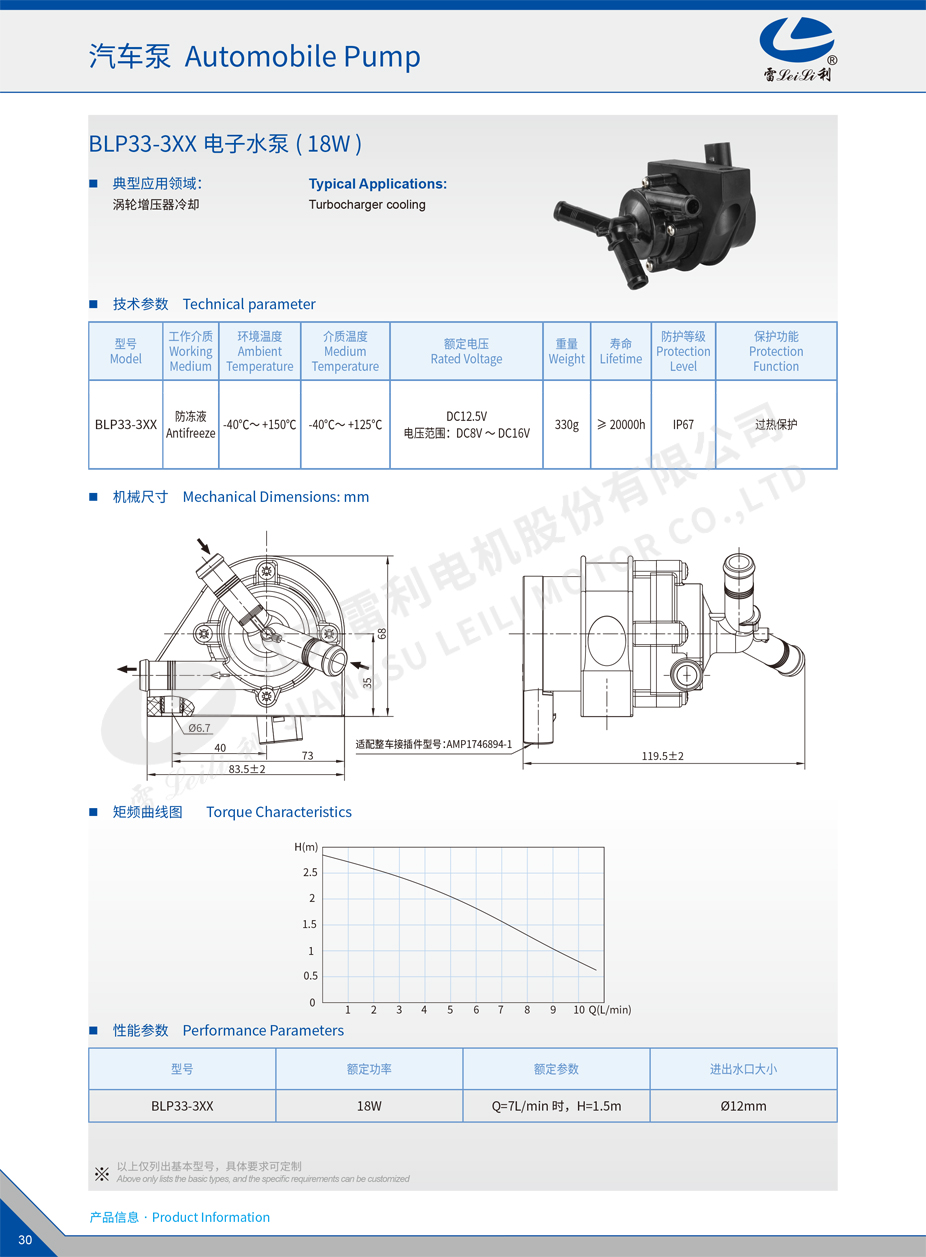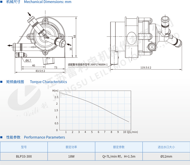 | BLP33-3XX | 18W | Q=7L/min 时,H=1.5m | Ø12mm |