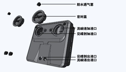 包括了洗碗块分配器、亮碟剂分配器以及洗碗液分配器等,其内置DC12V有刷电机驱动可控制洗碗块等耗材物料的定量投放。