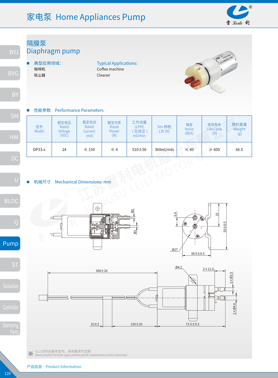 DP33-x 24 ≤ 150 ≤ 4 510±50 360ml/min ≤ 40 ≥ 600 66.5