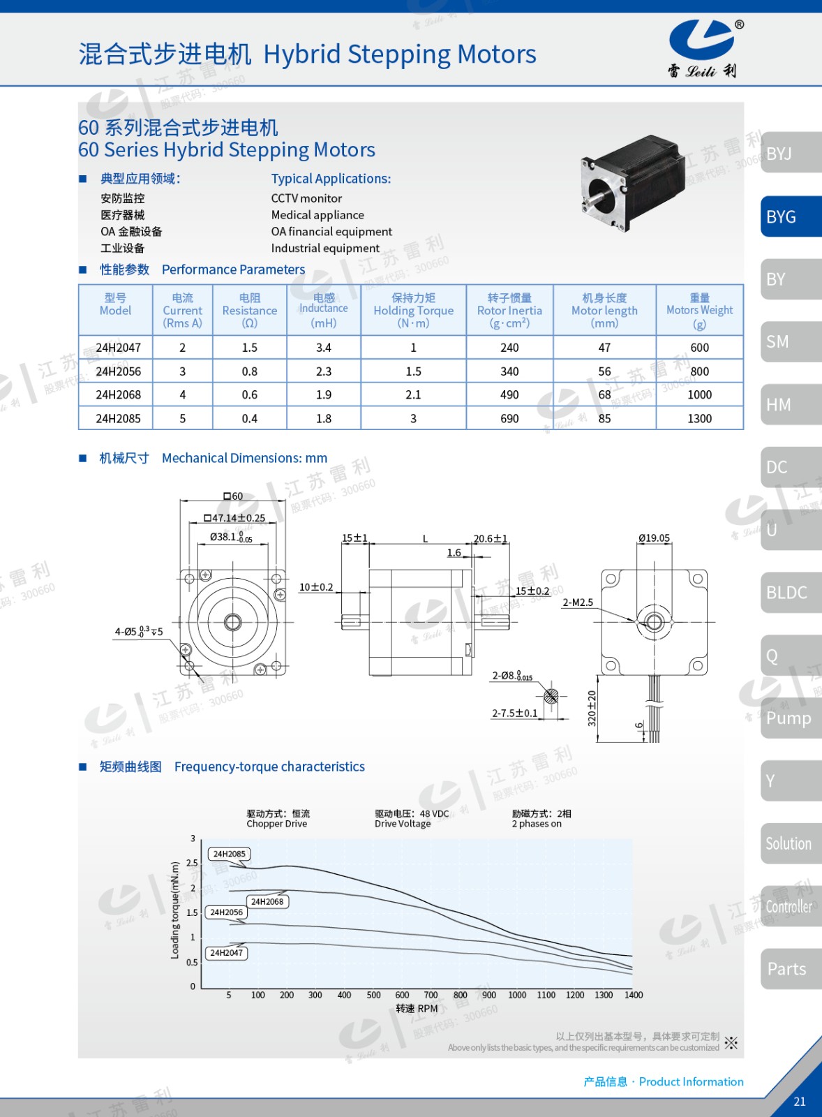 混合式步进电机有八种机座,尺寸分别为14mm、20mm、28mm、35mm、42mm、57mm、60mm和 86mm。