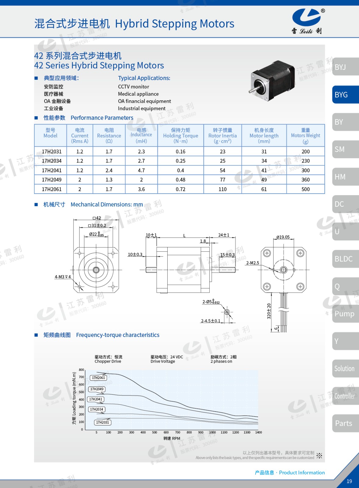 混合式步进电机有八种机座,尺寸分别为14mm、20mm、28mm、35mm、42mm、57mm、60mm和 86mm。