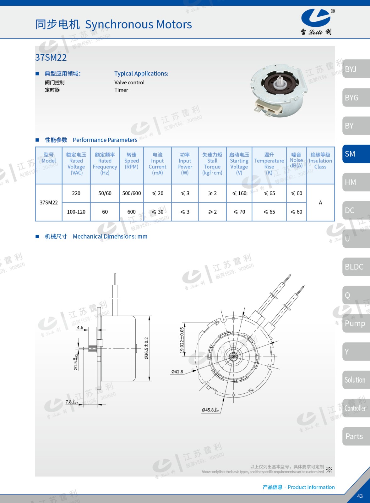 | 37SM22 | 220 | 50/60 | 500/600 | ≤20 | ≤3 | ≥2 | ≤160 | ≤65 | ≤60 | A |