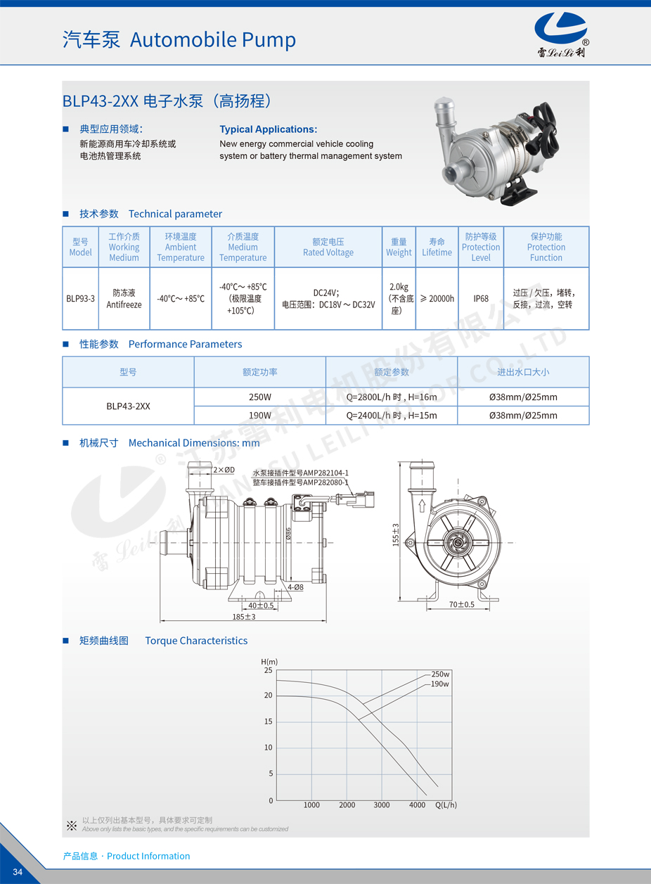 | BLP43-2XX | 250W | Q=2800L/h 时 , H=16m | Ø38mm/Ø25mm |