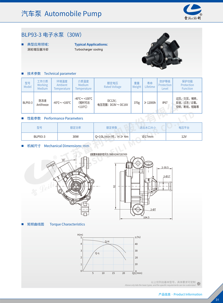 | BLP93-3 | 30W | Q=10L/min 时,H ≥ 4m | Ø17mm | 12V |