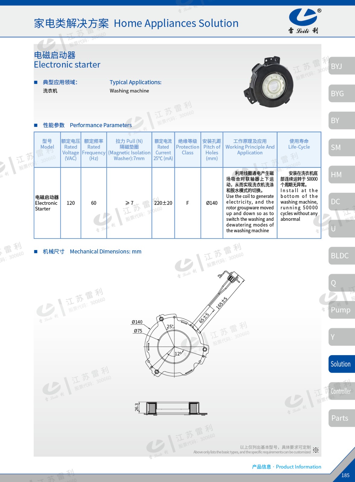 | 电磁启动器 | 120 | 60 | ≥ 7 | 220±20 | F | Ø140 | 利用线圈通电产生 磁 场 吸 合 对 联 轴 器 上 下 运 动, 从而实现洗衣机洗涤 和脱水模式的切换。 |