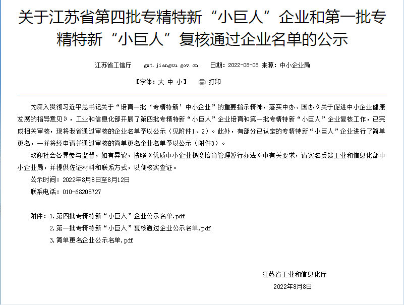 江苏haha体育子公司荣获国家级专精特新“小巨人”企业认定