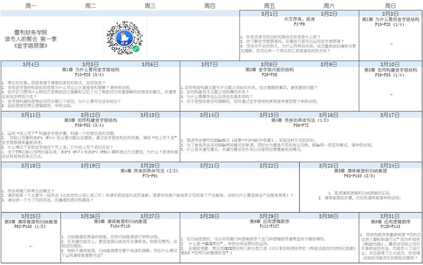 日前,学院第一期活动【读书人的聚会】已经启动,财务部李旸经理作为首位领读人,向学院推荐了被誉为经典管理的《金字塔原理》一书,并为学员们规划了详细的60天阅读计划。学院全员将共读此书,在小程序坚持打卡,积极分享心得体会,并力求学以致用,提升结构化的思考、表达和解决问题的能力。
