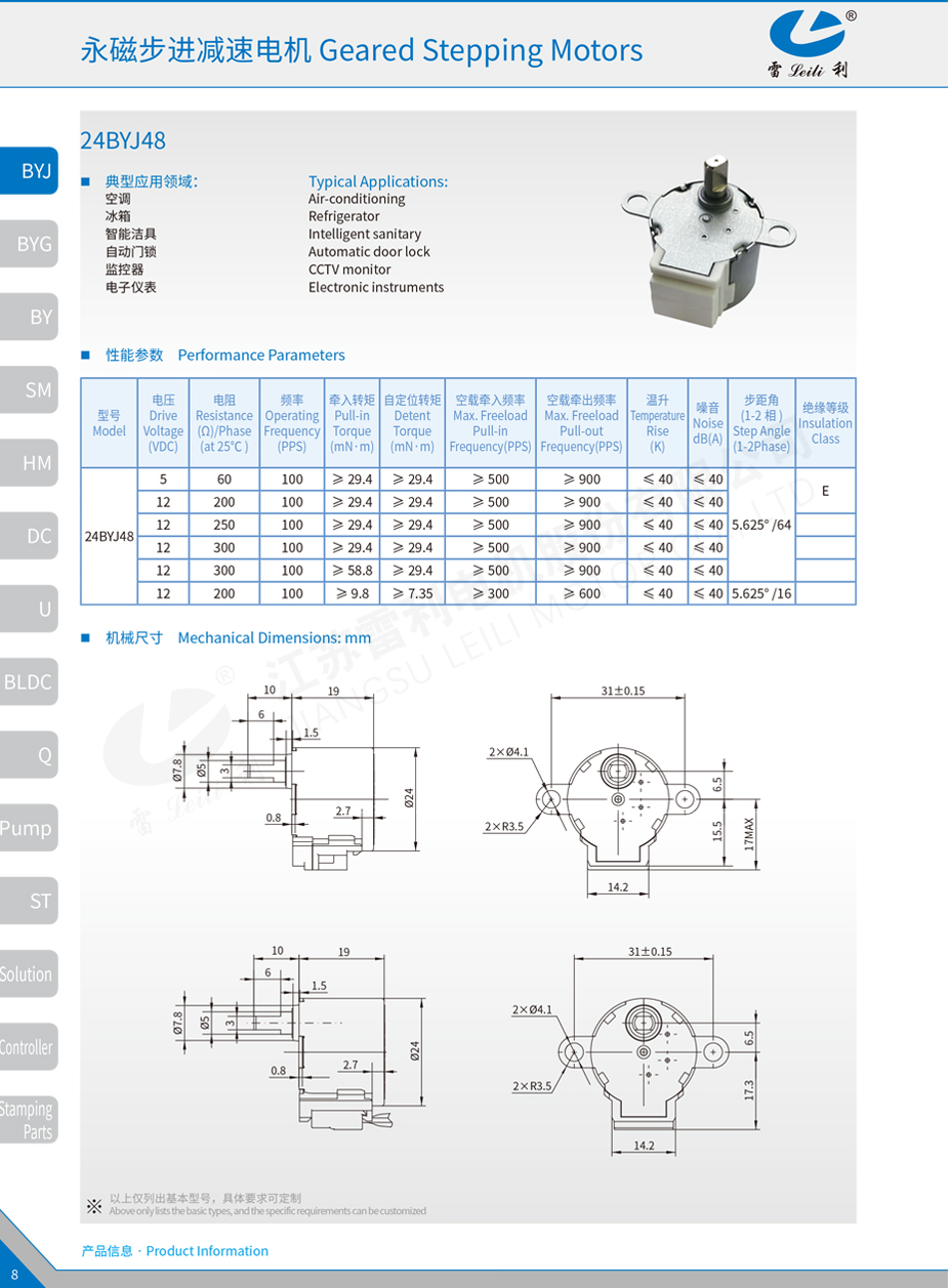 haha体育永磁式步进电机(BYJ系列步进电机)的转子用永磁材料制成,转子的极数与定子的极数相同。其特点是动态性能好、输出力矩大。