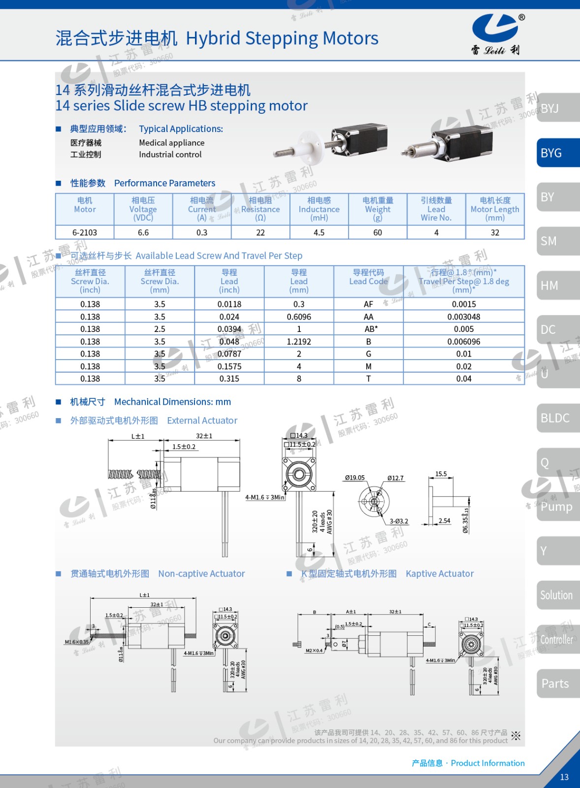 滚珠丝杆线性执行器有6种外形尺寸,14mm, 20mm, 28mm, 35mm, 42mm, 57mm,均为外部驱动式。从0.005mm/步到0.1mm/步,有多种步长可选。