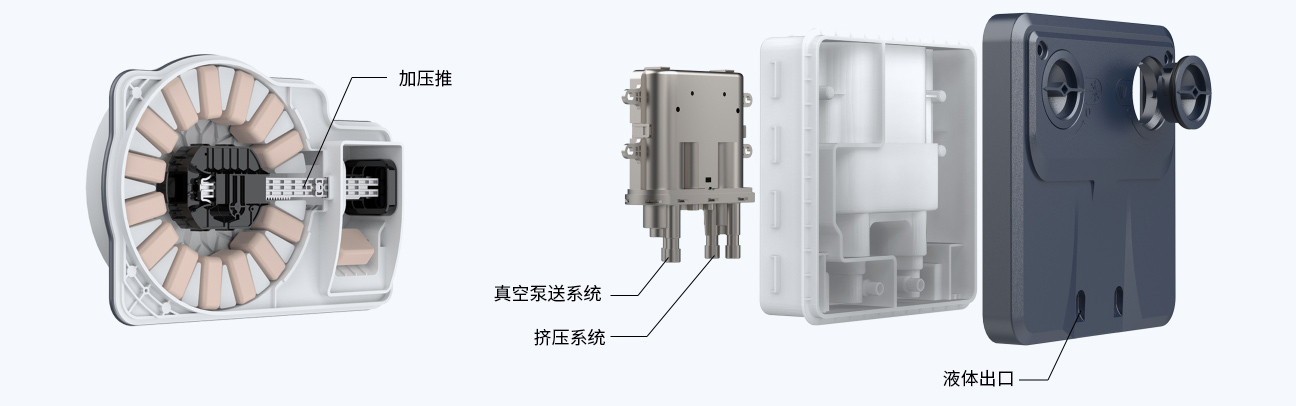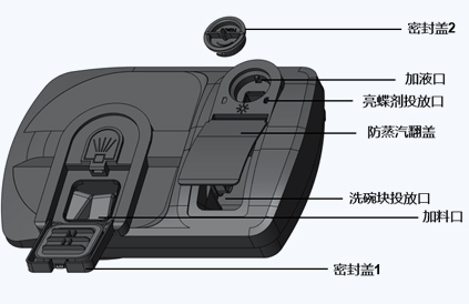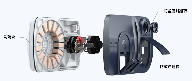 包括了洗碗块分配器、亮碟剂分配器以及洗碗液分配器等,其内置DC12V有刷电机驱动可控制洗碗块等耗材物料的定量投放。